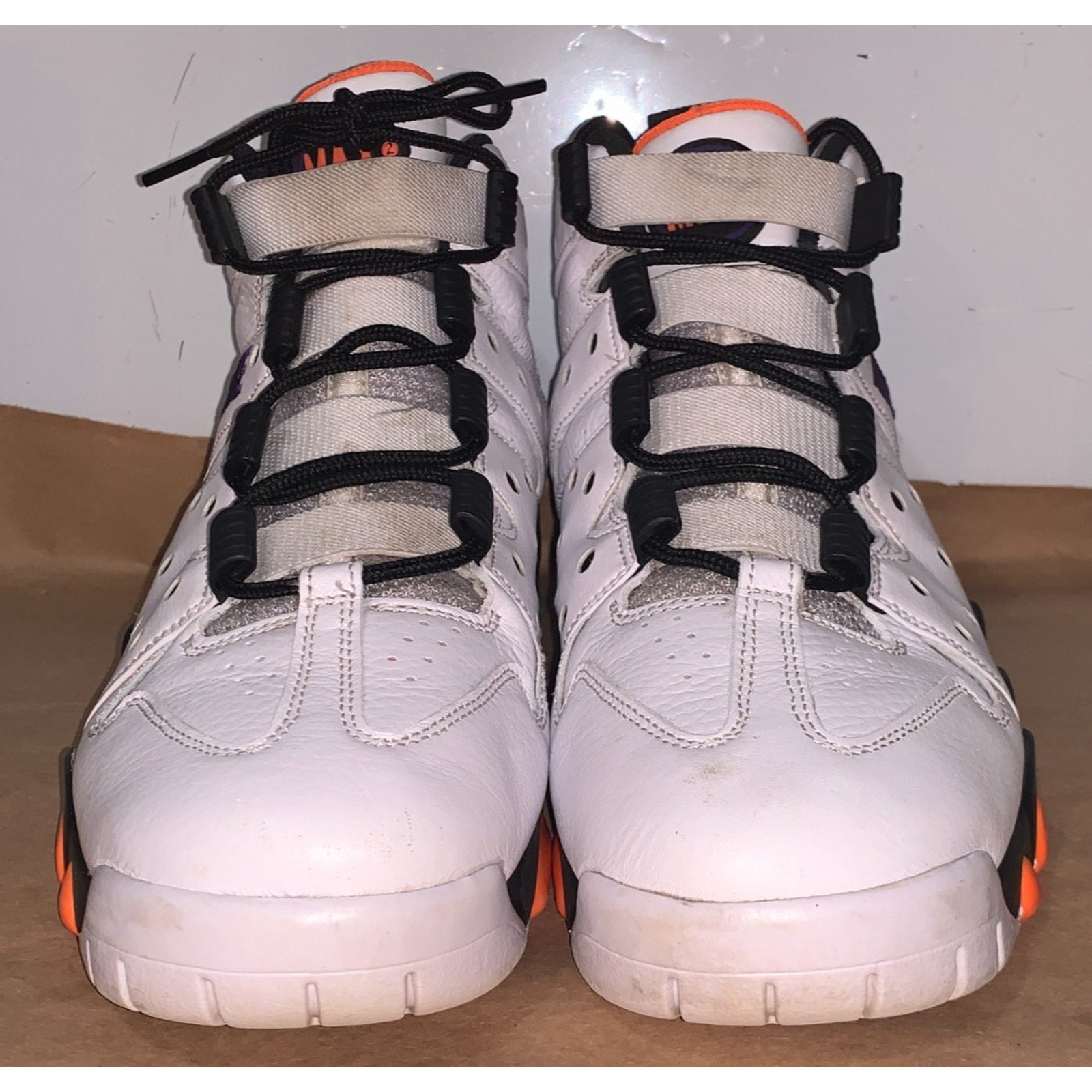 The Nike Air Max 2 CB '94 Suns in size 10.5 is a limited edition pair of athletic sneakers designed for men. These basketball shoes feature a mid-top shoe shaft style with a lace-up and pull-on closure, making them suitable for various occasions such as activewear, casual wear, or workwear. Made with a durable leather upper, these sneakers offer comfort and cushioning with a polyurethane insole and polyester lining. The color scheme of white, black, purple, and orange adds a vibrant touch to the design, perfect for the winter, summer, fall, or spring seasons. Ideal for cross-training, cross-fit, or basketball activities, these Nike Air Max are a stylish and functional choice for any man's wardrobe.